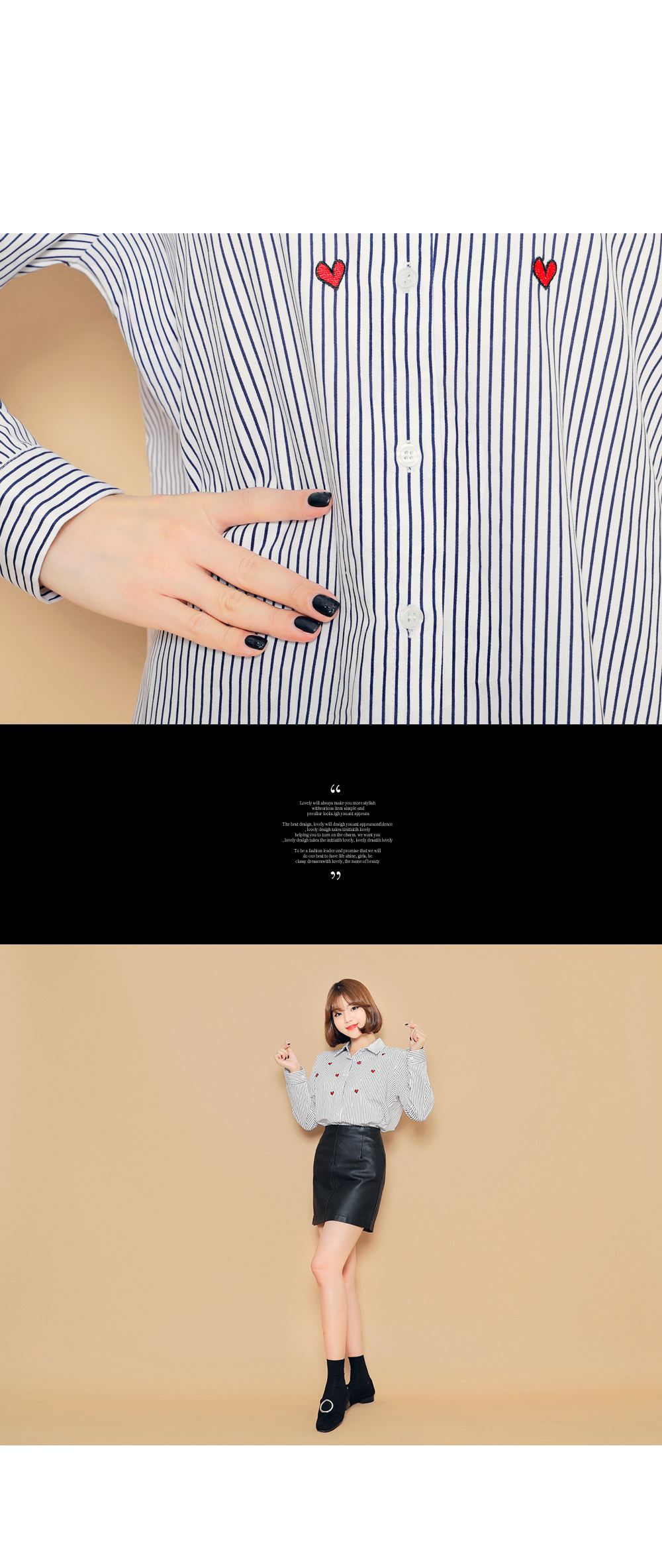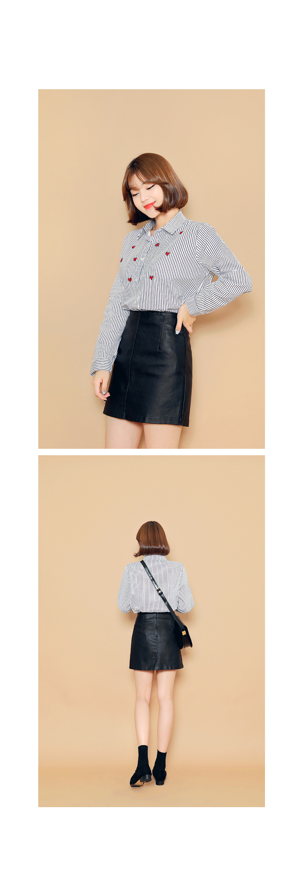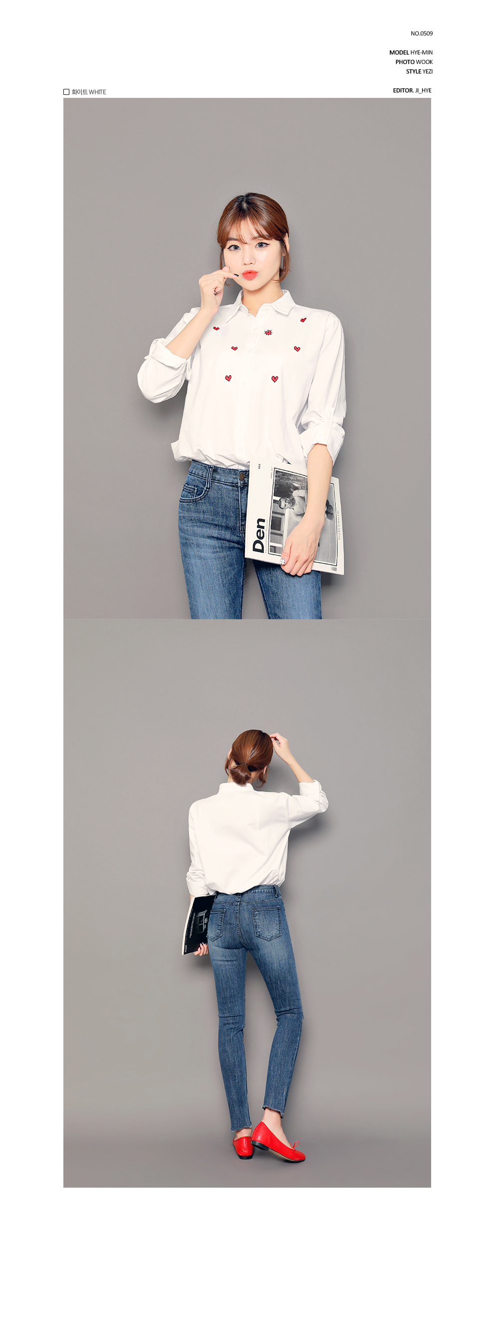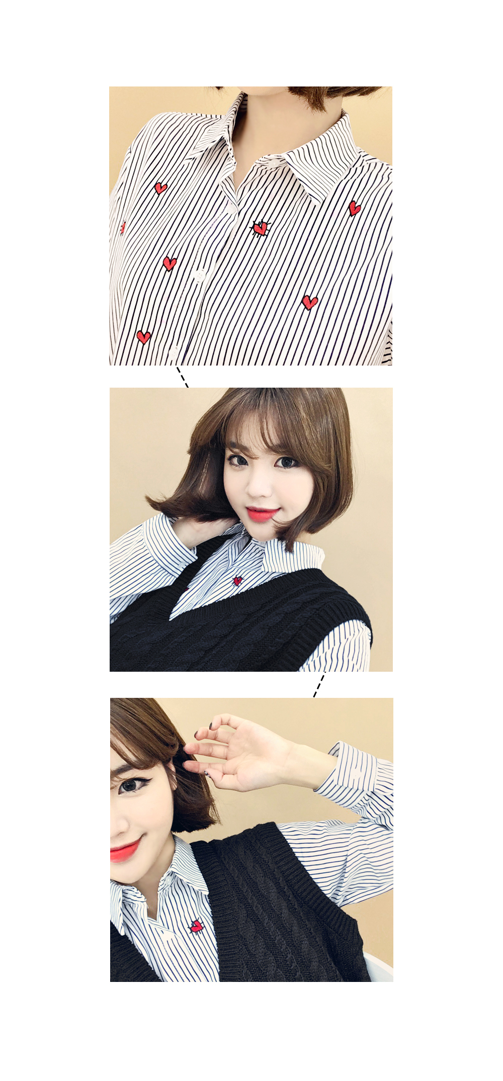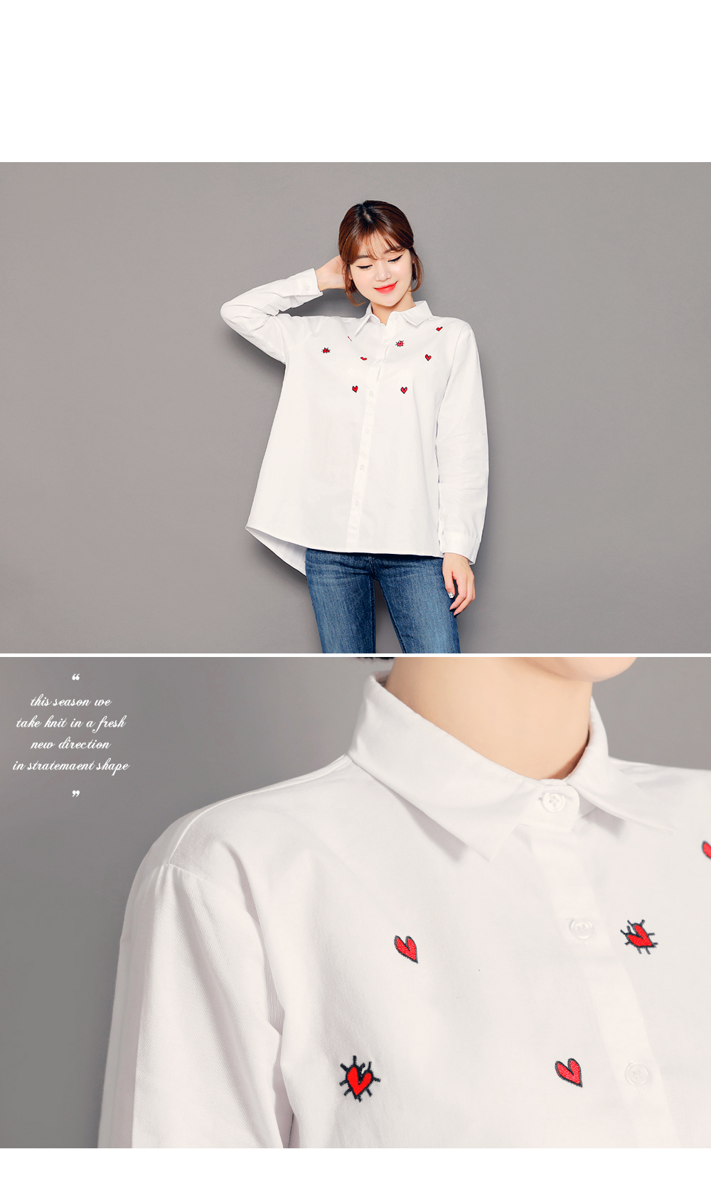ベーシックなフィット感で、デイリー使いしやすいブラウスです。フロントのハート刺繍がラブリーなポイントに♡裾はロールアップして着られるので、様々な雰囲気を楽します♬シンプルながらもコーデのポイントになります。ホワイトとブルーストライプの2色展開です。