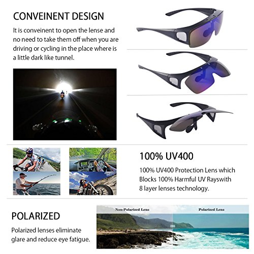 CONVEINENT DESIGN -It is convenient to flip up lenses and no need to take this sunglasses off when you are driving or cycling in a place where is a little dark like tunnel.