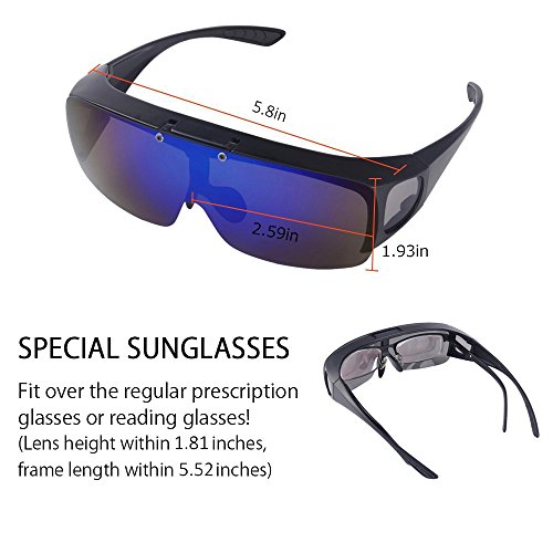 SPECIAL SUNGLASSES -Fit over regular prescription glasses or reading glasses! It is mirrored and barely sees that there are eyeglasses underneath them.