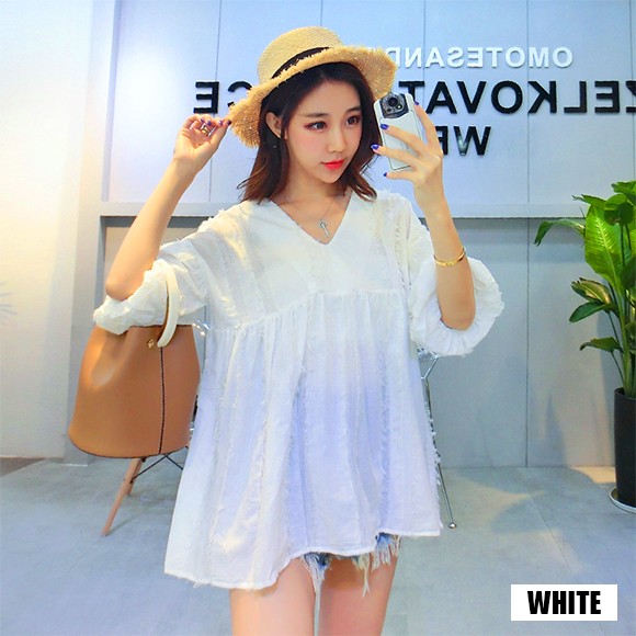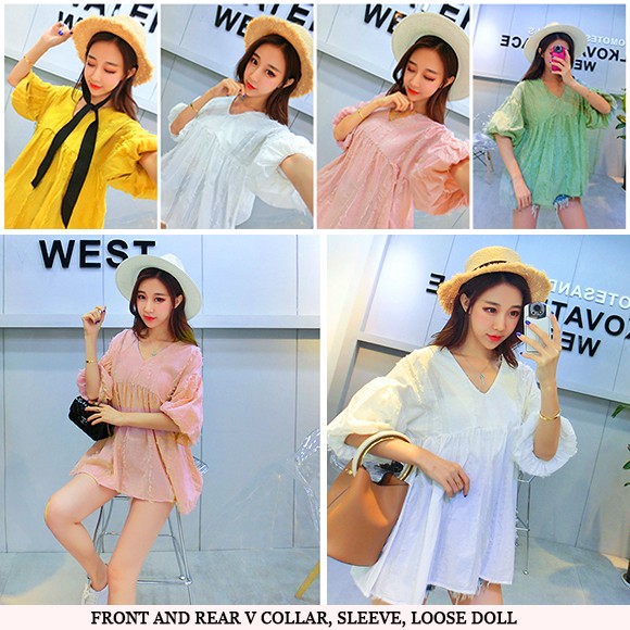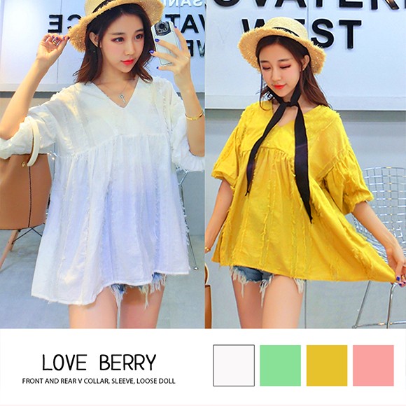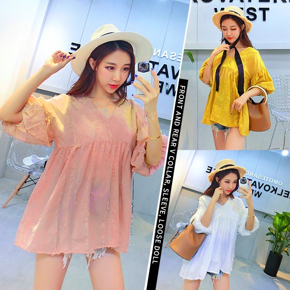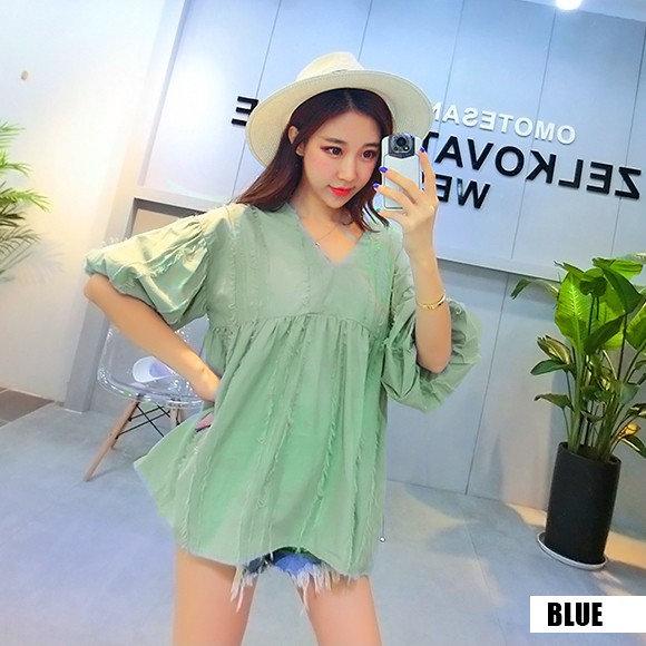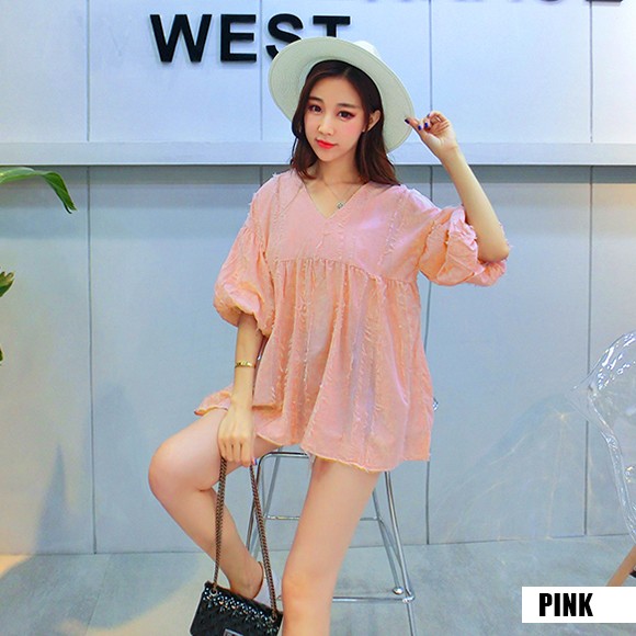 ボリュームのあるバルーンスリーブがカワイイ、盛り袖チュニック☆羽毛のようなアクセントがオシャレ♪