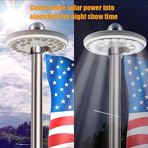 SUPER BRIGHT & SOLAR POWERED LIGHT: 26 super bright LEDs with 6 solar panels provide brighter light and greater energy than other NORMAL flag lights with 20 LEDs. Ideal for illuminating your flag, patio, tent, pathway, etc