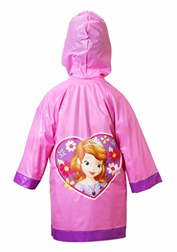 - Feature : Pink/Purple / Officially licensed Disney Junior Sofia the First girls apparel / Tailored from 100% Vinyl; Hooded / Features snaps down the front for easy on and off / Wipe clean with damp cloth; Imported