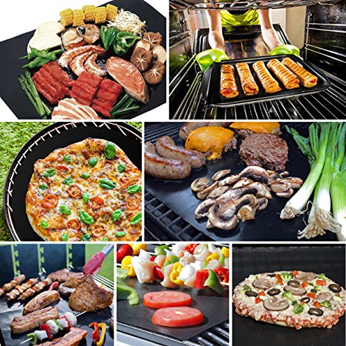 - [Set of 5 Reusable Grill Mats] Stop wasting money on aluminum foil or other disposable grill covers. Grill your meat, vegetables, fish, shrimp, pizza, kabobs, even pancakes, bacon and eggs without using cooking oil! The mat sits right over your grill grates preventing your food from falling through the cracks!