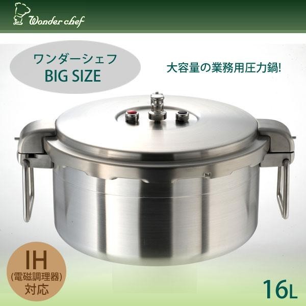 | 仕様 | 容量:16L 対応熱源:ガス火、IH・200V 食洗機:使用不可 底三層構造 作動圧力:98kpa(約2気圧)※気圧表示は大気圧1に鍋内圧を合わせた数値 水の容量/最高水位線:約10.6L・豆類線:約5.3L 最大炊飯量:22合 大豆最大煮量:1200g 保証期間:1年 |