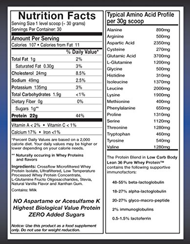 -. Binding : Health and Beauty -. Brand : Doctors Nutra Nutraceuticals -. EAN : 0856471003619 -. Feature : The Next Generation Protein: Over 9000 mg of Essential Amino Acids per scoop! / NO Artifical Sweeteners - no Aspartame or Acesulfame K - All Natural / Highest Biological Value Protein, 22g protein per 30g scoop / also contains 1000mg of L-Glutamine (in addition to naturally occurring L-Glutamic acid) per serving / Low Carb (1.9g per scoop), Low fat (1g per scoop), No Soy -. IsAdultProduct : 0 -. Label : Doctors Nutra Nutraceuticals -. Manufacturer : Doctors Nutra Nutraceuticals -. MPN : DN-WP-FV-2 -. PackageQuantity : 2 -. PartNumber : DN-WP-FV-2 -. ProductGroup : Health and Beauty -. ProductTypeName : HEALTH_PERSONAL_CARE -. Publisher : Doctors Nutra Nutraceuticals -. Studio : Doctors Nutra Nutraceuticals -. Title : Pure 100% Whey Protein Low Carb Low Fat French Vanilla Flavor Powder All Natural Ultrafiltered with High Branched Chain Amino Acids and 1000 mg L-Glutamine. No Artificial Sweeteners or Flavors. 2 Pounds (Pack of 2) -. UPC : 856471003619