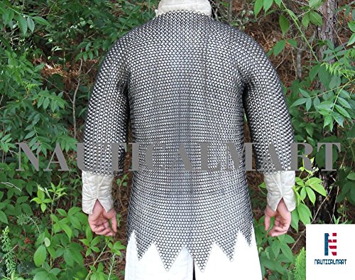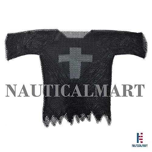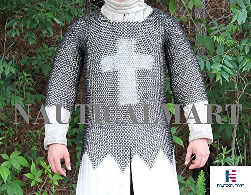 Studio : NAUTICALMART INC Publisher : NAUTICALMART INC Product Description The Knights Templar was a powerful Christian military order during the time of the Crusades. Templar knights, in their distinctive white mantles with a red cross, were among the most skilled fighting units of the Crusades. Mail (chainmail, maille) is a type of armor consisting of small metal rings linked together in a pattern to form a mesh. A haubergeon is a chainmail that is smaller or shorter than a hauberk usually referred to a "little Hauberk". This particular haubergeon is made with the bottom having a triangular shaped fringe. This maile can be used for competitions, training, LARP, Renaissance fairs, and costumes. Our chainmaile is handmade so we can provide our customers with a high quality product at an affordable price. All of our chainmail comes slightly oiled to prevent rusting and prolong the life of the maile. "A Templar Knight is truly a fearless knight, and secure on every side, for his soul is protected by the armor of faith, just as his body is protected by the armor of steel. He is thus doubly armed, and need fear neither demons nor men." Specifications: Overall Length: 30 Inches Overall Width: 25 Inches Chest Size: 50 Inches Construction: Blackened Mild Steel Ring Pattern: Butted Arm Width: 9 Inches Arm Length: 11 Inches Size: Large Design: Templar Cross MANUFACTURED SOLD BY NAUTICALMART INC. 0