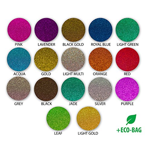 ULTIMATE GLITTER HEAT TRANSFER VINYL STARTER KIT - 17 of our MOST POPULAR 10”x12” inch colors (sheets not rolls) including Pink, Lavender, Black Gold, Royal Blue, Light Green, Aqua, Gold, Light Multi, Orange, Red, Gray, Black, Jade, Silver, Purple, Leaf, and Light Gold glitter HTV