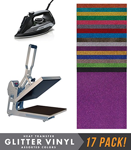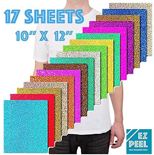 EZ Peel - Iron On Glitter Heat Transfer Vinyl - 17 Pack 12x10 inch HTV Sheets - Pink, Lavender, Royal Blue, Green, Acqua, Gold, Orange, Red, Grey, Black, Silver, Purple, and more HTV Easy Weed Colors
