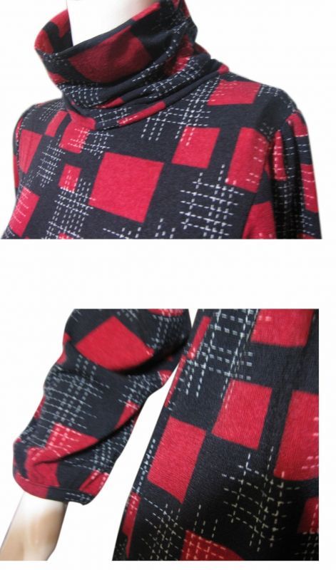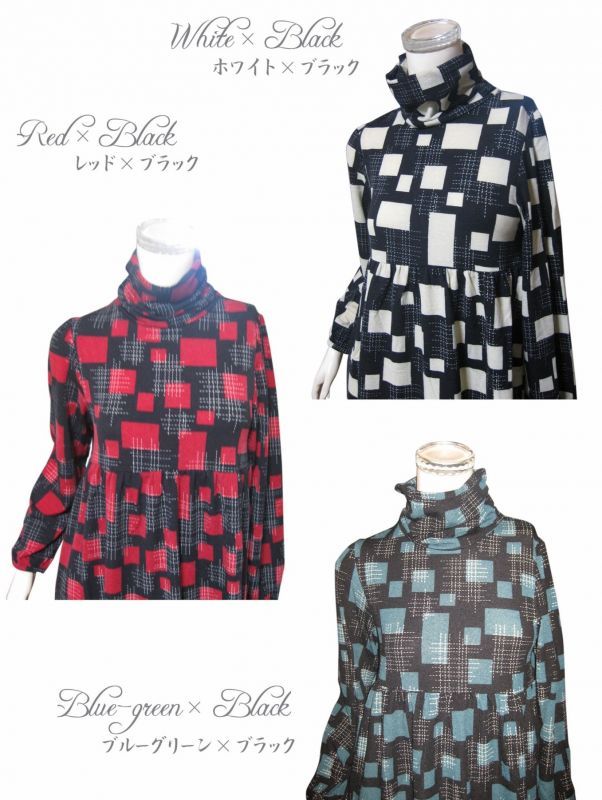 | 鮮やかなプリントが目を引くハイネックデザインワンピース A柄 3色 | |