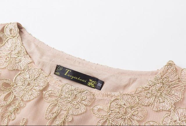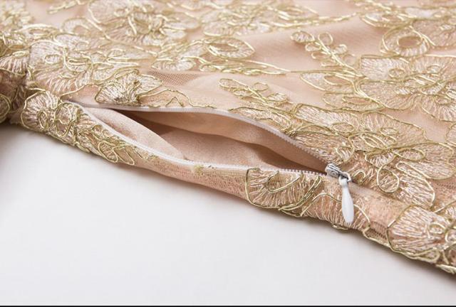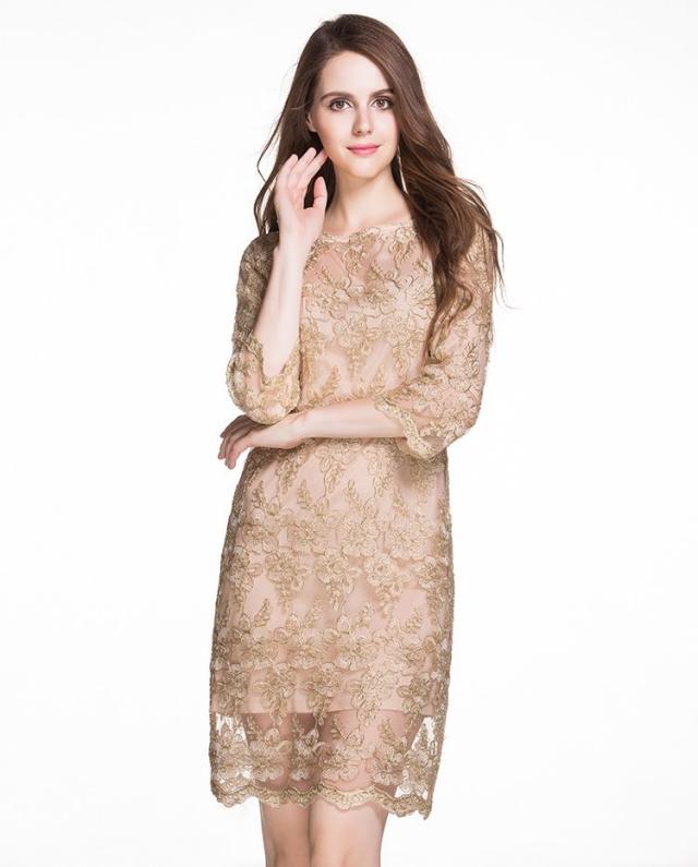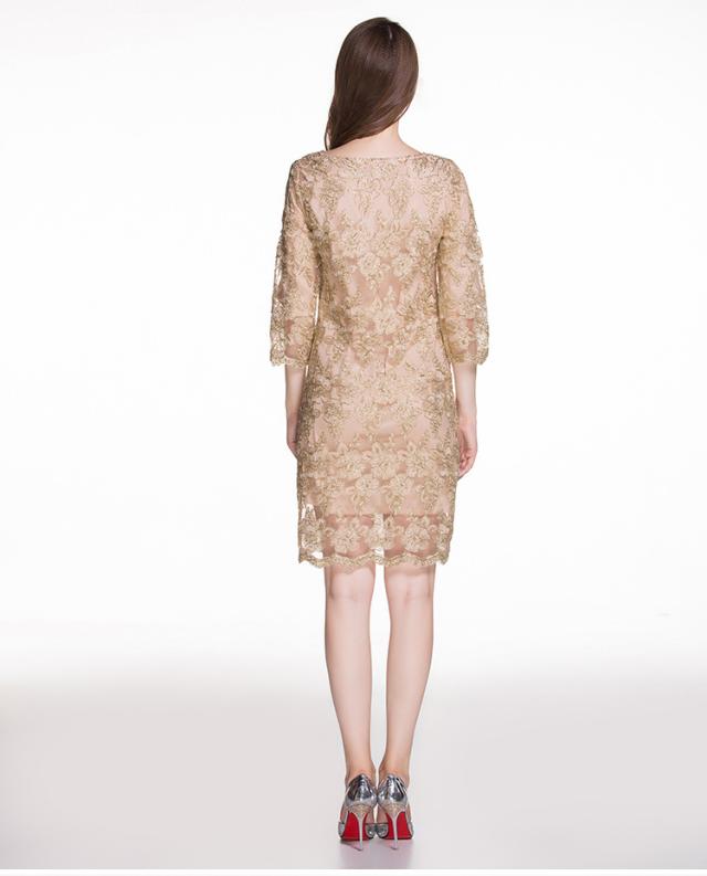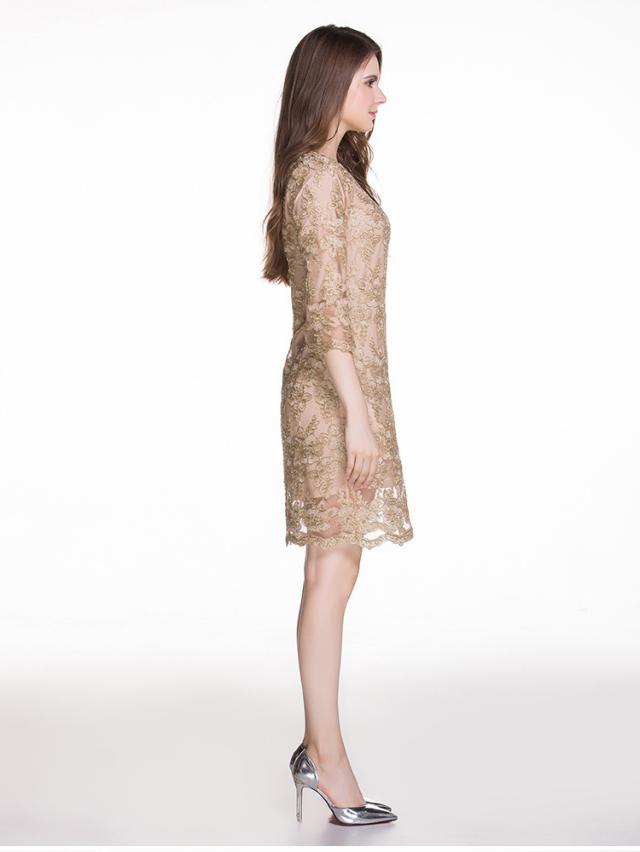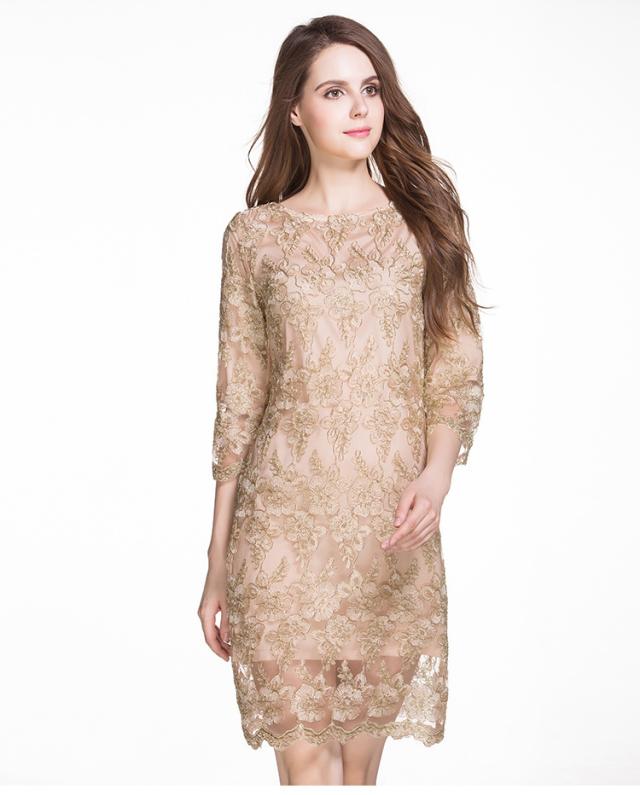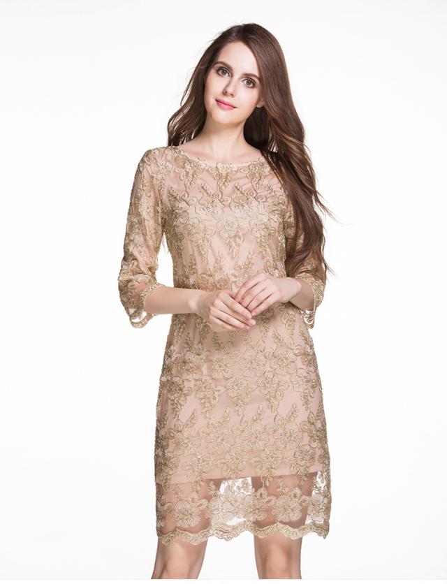 レース 刺繍 七分丈 長袖 ワンピース パーティードレス 結婚式 二次会 披露宴 パーティー デート 女子会 食事会 卒業式 謝恩会 親族 お呼ばれ フォーマル 演奏会 コンサート 発表会 膝丈 大きいサイズ L 2L 3L 4L 5L ゴールド 20代 30代 40代 フレア
