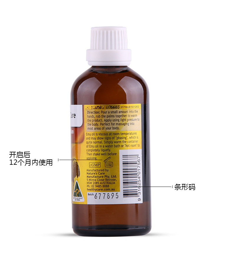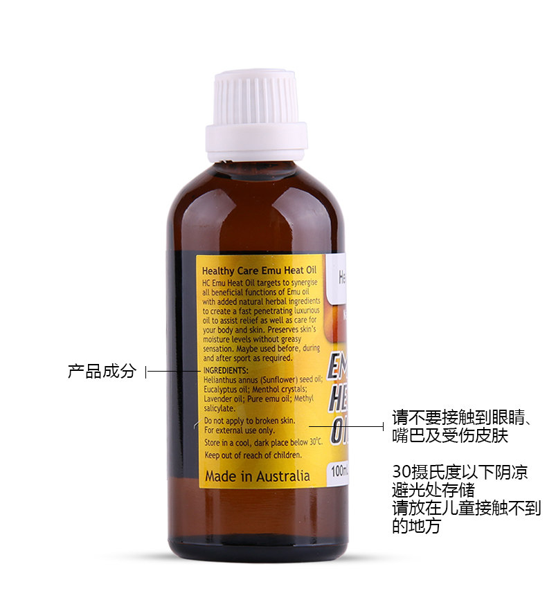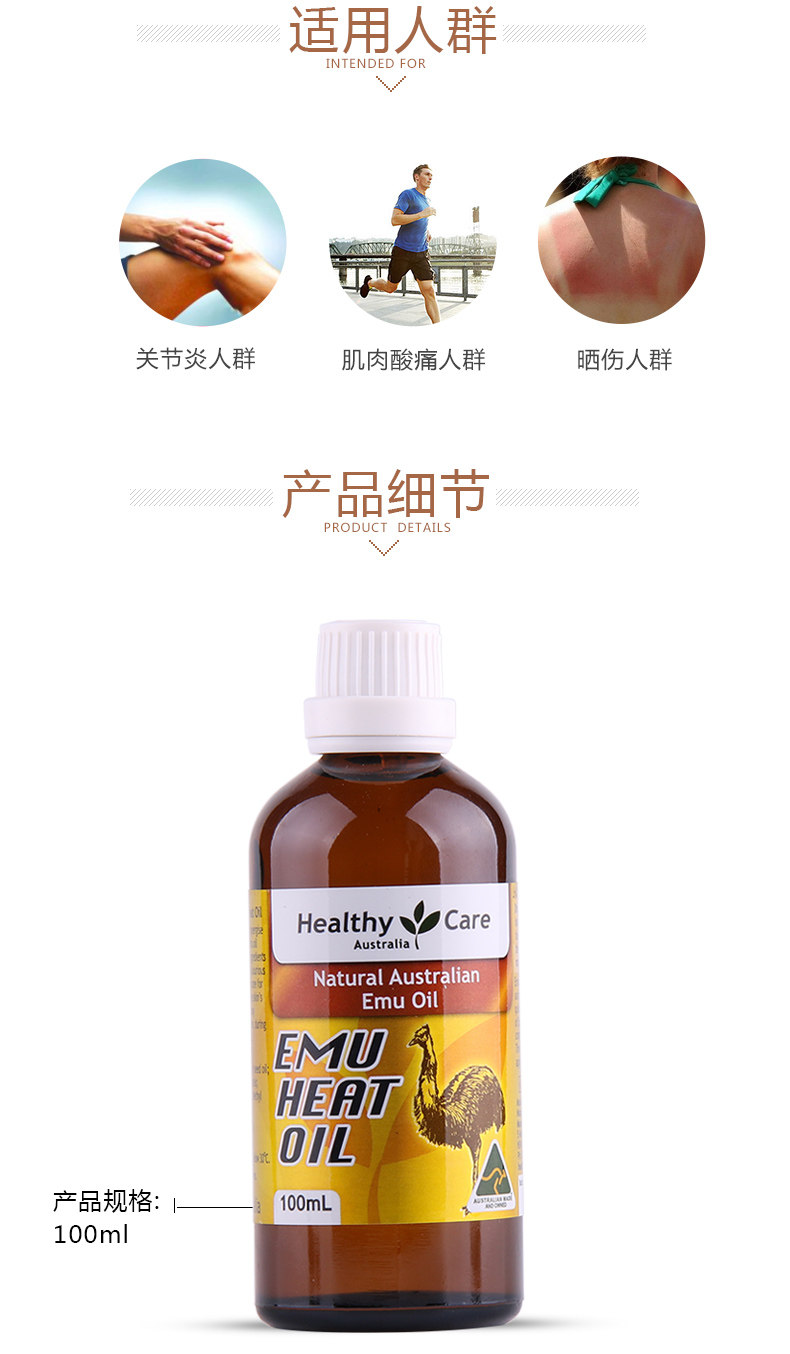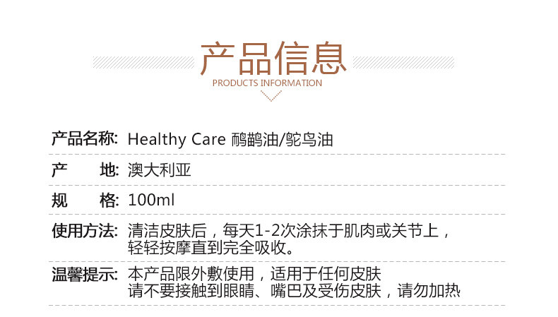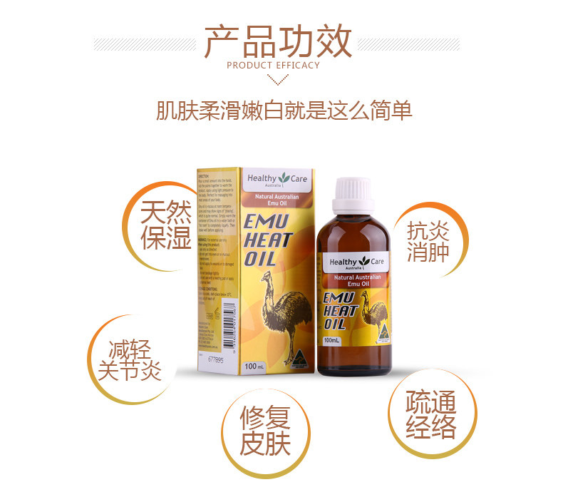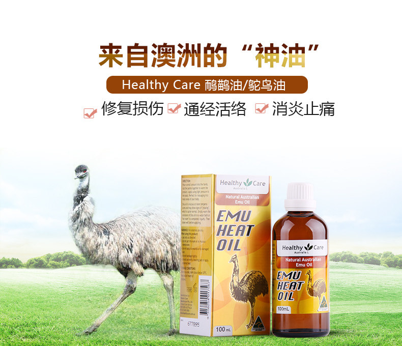 roduct parameters:Product Name: Healthy Care Emu OilWhether for special-use cosmetics: NoSpecifications Type: normal specificationsEfficacy: injury repairCosmetics net content: 100mlBrand: Healthy CareBody care products: ostrich oil