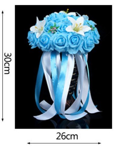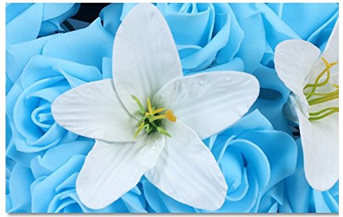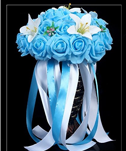 - Feature : Bridal Bouquet made with blue roses, white Lily / 26pcs Bridal Bouquet diameter 26cm height 30cm / Silk flowers won't wilt in the heat or freeze in the cold. The consummate choice for all weather conditions / You can use flowers that may normally be out of season and there are also a wide variety of colors, above and beyond the limitations of mother nature. / The silk flowers available to us today are so glamorous and realistic you will be amazed. We think that many of the flowers are even more vibrant and beautiful that their fresh counterparts.