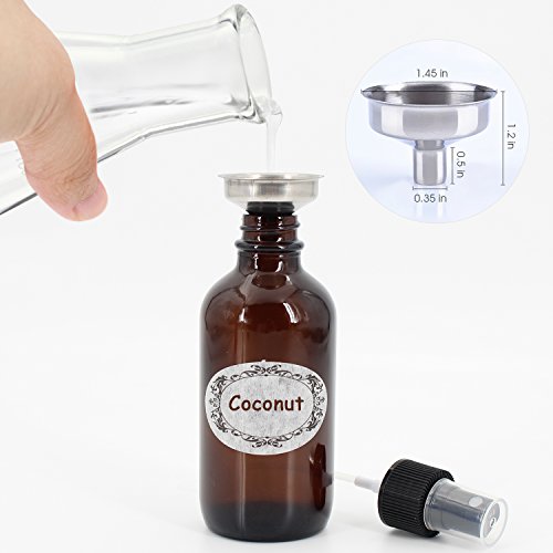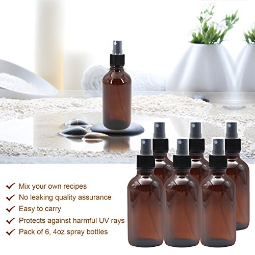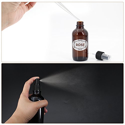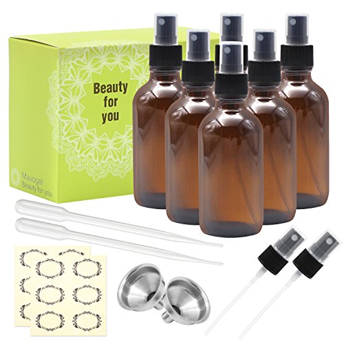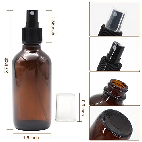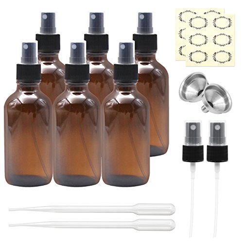 Packaged: 6* 4 oz Amber Glass Sprayer Bottles with fine mist sprayer 6* Bottle Labels 2* Extra Black Fine Mist Sprayers 2* Stainless Steel Mini Funnel 2* 3ml Transfer Pipettes