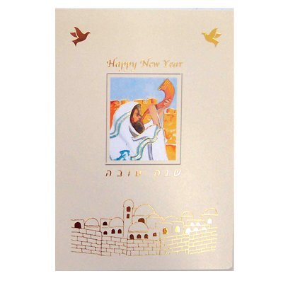 -. Feature : Alef Judaica New Year Greeting Cards / Size: 6.75 X 4.75 Inches / Beige Colored with Gold Dove and Image of Rabbi Blowing Shofar Design