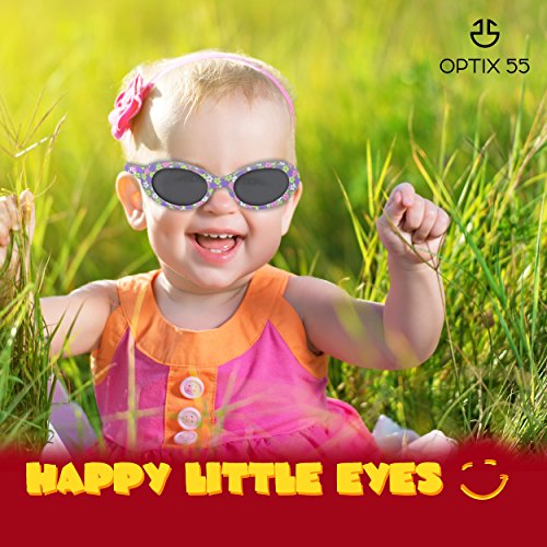 Product Description PROTECT YOUR BABY'S PRECIOUS EYESIGHT At the beach or on the go, even when it's overcast, the sun's rays are always beating down on us. But those sunny rays that feel so great on our skin can be damaging, especially to your baby's sensitive eyes. Protect their eyes in style with these adorable sunglasses from Optix 55 which are designed specifically to fit babies and toddlers aged 1 month to 3 years. About This Product: ? 100% UV Protection ? Smoked Lenses ? Neutralizes Glare So Objects Appear Clearer Brighter ? Baby Sees Clearly To Avoid Accidents ? Assorted Colors ? Designed to Fit Babies Toddlers Ages 1 Month-3 Years ? Durable Design For Long-lasting Performance ? Perfect For High Impact Activities ? Matching Pouch Included STYLISH SMOKED SUNNIES FOR SAFER PLAYTIME Our smoked lenses provide UV Protection and reduce glare, so your child sees objects and the world around them more brightly and clearly, to avoid accidents and prevent eye strain. Your baby will enjoy hours in the sun with you while their delicate eyes are protected from harmful UV rays. You can have peace of mind knowing your baby is having fun in the sun safely and comfortably. SUPERIOR QUALITY SELECTION Optix 55 brings you the best in fashionable, functional infant eyewear with these sunglasses that will have your little one stepping out in style with full protection from damaging sun rays. These sunglasses are perfect for protecting your child's delicate eyes when out for a day at the beach, the pool and any other outdoor excursions. Because your babies eyes are particularly delicate they need protection from the sun even on days that aren't extremely sunny making this a worthwhile investment that you can use year round. With so many styles and colors to choose from, Optix 55's Sunglasses for Babies are the obvious choice to keep your baby's eyes protected with flair! 0