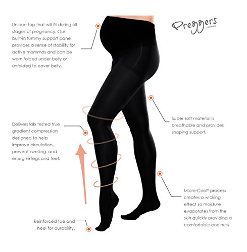Preggers Opaque Maternity TightsSwelling? Tired, achy legs? Preggers Maternity Tights feature light gradient compression are designed to increase circulation, reduce & prevent swelling and relieve tired, achy legs. Plus, they are cute. Super cute. Pair with your favorite maternity dress or skirt. Belly portion can fold down and under or up and over growing bumps. Available in Black, Coal, Cocoa, Navy, Papyrus and Winter White. Features: 10-15 mmHg light gradient compression Tummy support panel can be folded down or pulled up and over bellies; smooth seams will not dig into tummies or show under clothes Reinforced & rounded toe for durability and comfort Super soft, breathable, shaping support Moisture wicking properties keep skin comfortably cool Made in the USA Hand wash in cool water. Line Dry.Feature