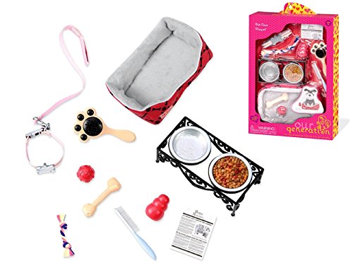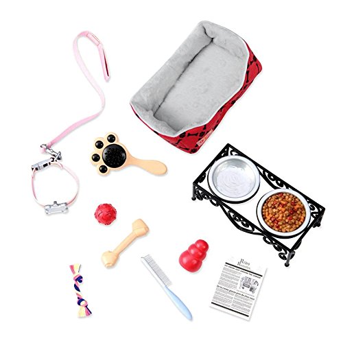 COMES WITH: 1 dog bed, 1 collar with leash, 1 bowl stand, 1 bowl with dog food, 1 bowl with water, 1 bone, 1 ball, 1 treat toy, 1 knotted rope, 1 comb, 1 brush, 1 newspaper