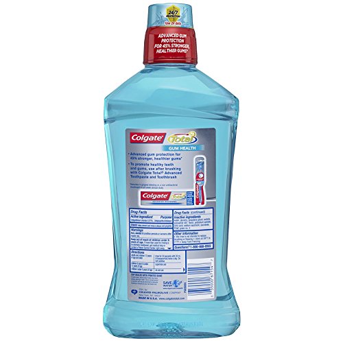 -. Binding : Health and Beauty -. Brand : Colgate -. EAN : 0035000671547 -. Feature : Advanced protection for 45% stronger, healthier gums (reduction in gingival bleeding vs. A non-antibacterial mouthwash in a 6 week clinical study) / Fights plaque between teeth & along the gum line / Kills 99% of germs on contact / 12-Hour protection against bacteria that cause gingivitis -. Label : Colgate-Palmolive Co -. Manufacturer : Colgate-Palmolive Co -. NumberOfItems : 1 -. PackageQuantity : 1 -. ProductGroup : Pantry -. ProductTypeName : BEAUTY -. Publisher : Colgate-Palmolive Co -. Studio : Colgate-Palmolive Co -. Title : Colgate Total for Gum Health Mouthwash, Clean Mint - 1L, 33.8 fluid ounce -. UPC : 035000671547