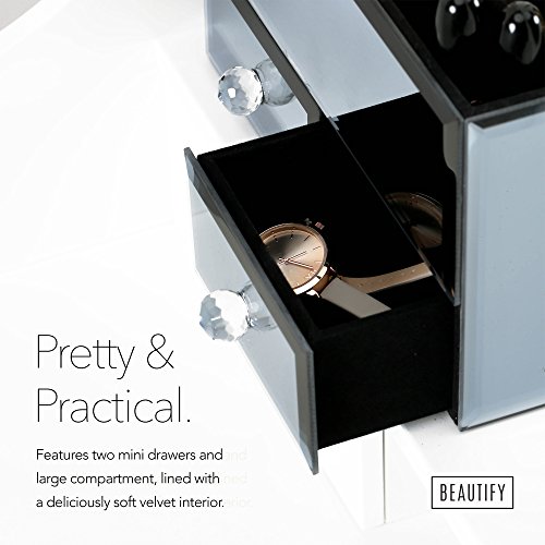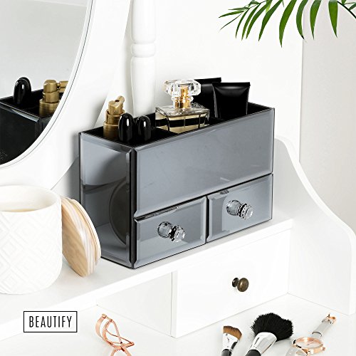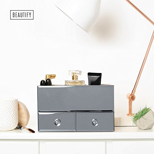 Beautify Gray Mirrored Jewelry Box and Cosmetic Makeup Organizer with 2 Drawers, 5 Sections and Glass Cleaning Cloth
