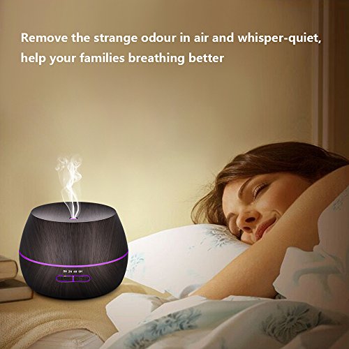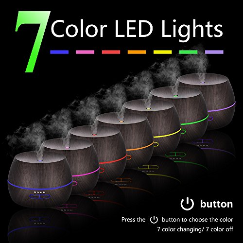 - ▶Natural Wood Grain Design with 7 beautiful color changing LED lights:This aroma diffuser is coated with wood grain, which makes it look very primitive and nice. 7 colors rotating through / Lights off. A perfect nightlight for a kid's bedroom and soft light creates romantic atmosphere which helps you escape the hustle and bustle of modern life.