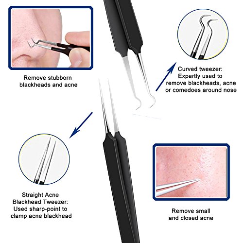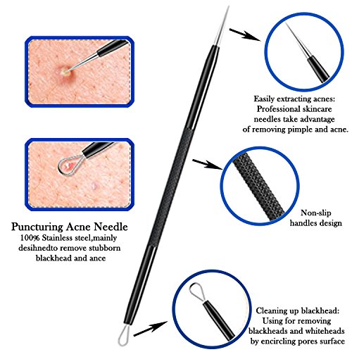 - Ergonomic design: This pimple extractor kit non-slip handles design helps you dealing with different types of blackhead, whitehead, pimples, blemishes and acnes without any effort, ensuring every step can be done with exceptional control and precision to avoid the skin destroyed.