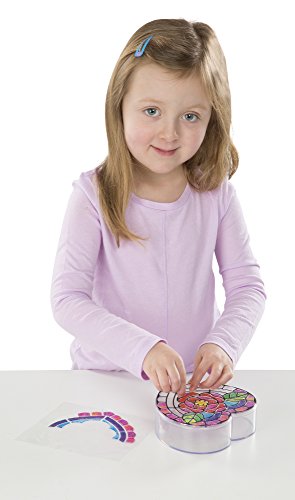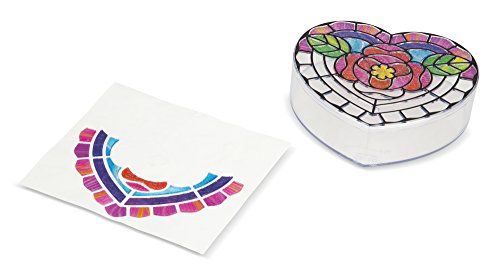 This peel-and-press sticker craft gives kids everything they need to easily create a spectacular "stained glass" heart-shaped trinket box. Just hold up the sheet of colored stickers to the clear frame on the box lid, peel them off one at a time, and stick them on. Grooves and outlines on the frame make it easy to fit each sticker--featuring realistic textures like bubbles or swirls--into just the right spot. Use the beautiful and durable plastic 5.5" x 5" x 1.5" box to hold treasures and keepsakes. Young artists will be enchanted by the results and proud to show them off!.Feature