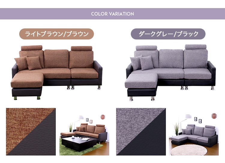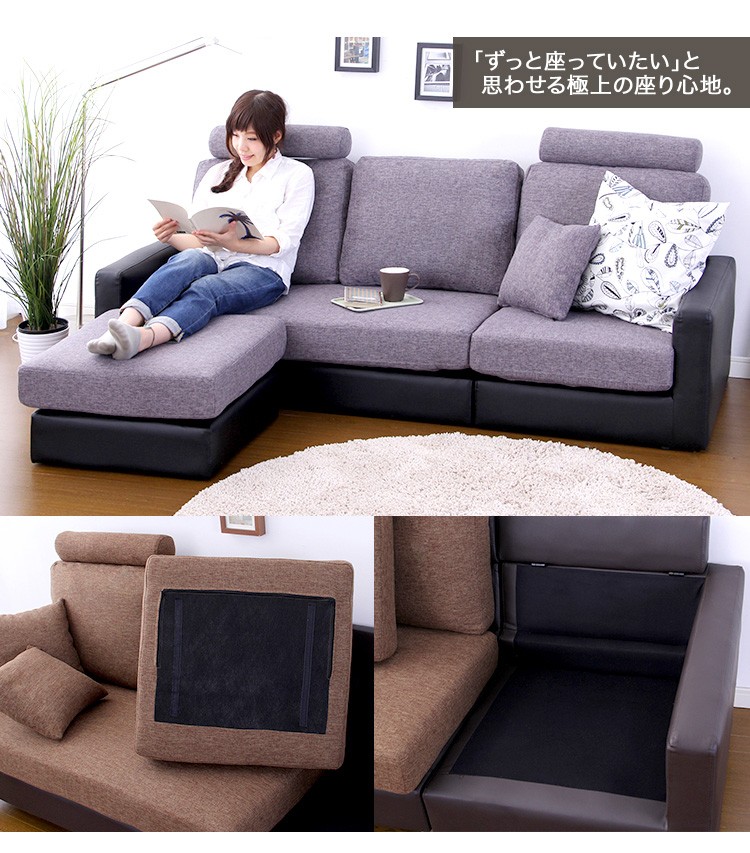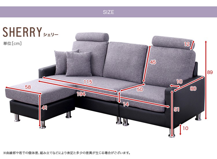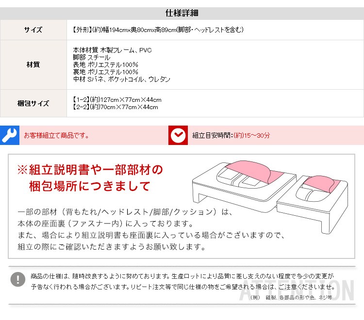 【商品について】 3人掛けカウチソファ【シェリー-Sherry-】 ■サイズ: 外寸:(約)194x80x89cm(ヘッドレスト・脚部含む) ※商品重量:(約)50kg ■カラー: ライトブラウン/ブラウン ダークグレー/ブラック ■素材: 本体:木製フレーム 表地:ポリエステル100% PVC 裏地:ポリエステル100% 中材:Sバネ、ポケットコイル、ウレタン 脚部:スチール ■その他: ・お客様組立商品です ・梱包サイズ: (2-1)(約)127x77x44cm(15.9才)(約)33kg (2-2)(約)70x77x44cm(8.7才)(約)21.5kg ※メーカー直送品、代引き不可【商品について】