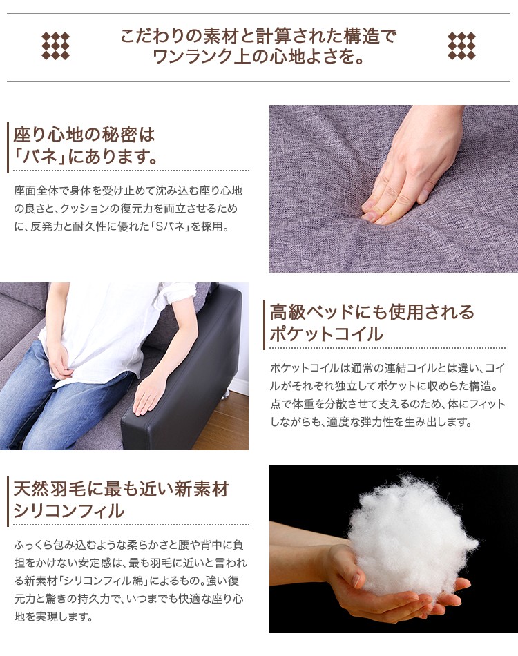 中材:Sバネ、ポケットコイル、ウレタン 脚部:スチール