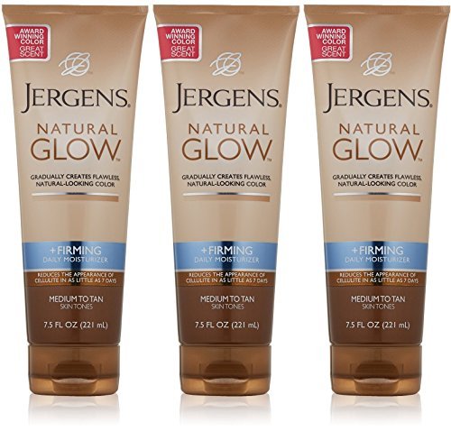 Gradually creates natural-looking color. Clinically proven to reduce the appearance of cellulite in as little as seven days. Moisturize into a firming glow. Jergens Natural Glow Firming Daily Moisturizer gradually creates fabulous natural-looking color with a subtle skin darkening complex and is clinically proven to reduce the appearance of cellulite. The collagen & elastin formula firms skin, so in as little as seven days of daily use you'll experience tighter, firmer skin with less noticeable cellulite and improved elasticity. Designed specifically for medium/tan skin tones, you'll reach your optimum intensity of color after about one week of daily use. Continue to use it daily to maintain your healthy glow. Made in USA.Feature