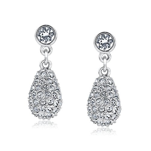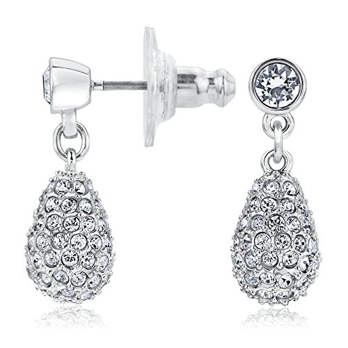 A sparkling teardrop shape embellished in sparkling clear crystal pavé dangles with this elegant pair of rhodium-plated earrings. This creation is easy to wear and adds a subtle touch of glamour to any look for just about any occasion.Feature