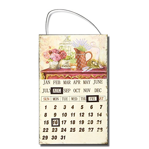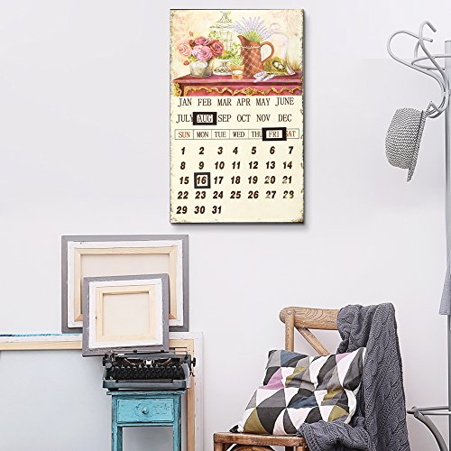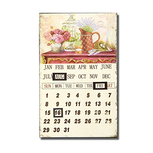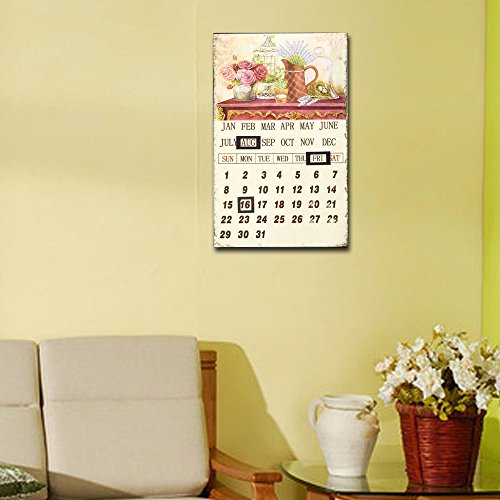 Homebeez Decorative Vintage-Inspired Iron Sign Calendar with Watering Can and Rose Detail, Off-White/Pink
