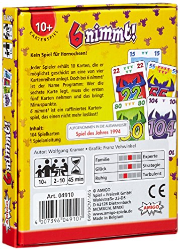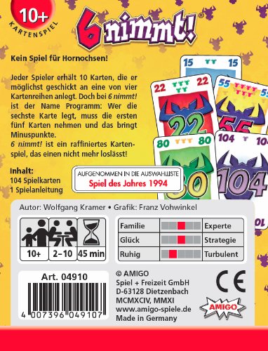 Jede Karte d ie man nehmen muss, bringt Kartenspiel, das einen nicht mehr loslasst. Ziel ist es, keine Bei 6 nimmt! ist der Name Programm. Es ist ein raffiniertes den Hornochsen eine zeitgemasse Uberarbeitung! Seit uber 17 Jahren ein beliebter Klassiker, erhalt das Spiel mit