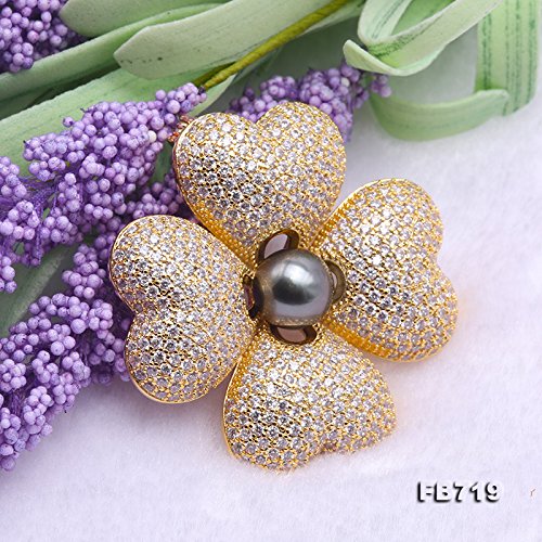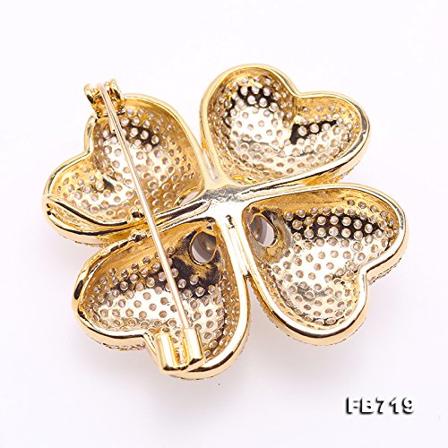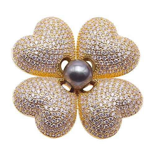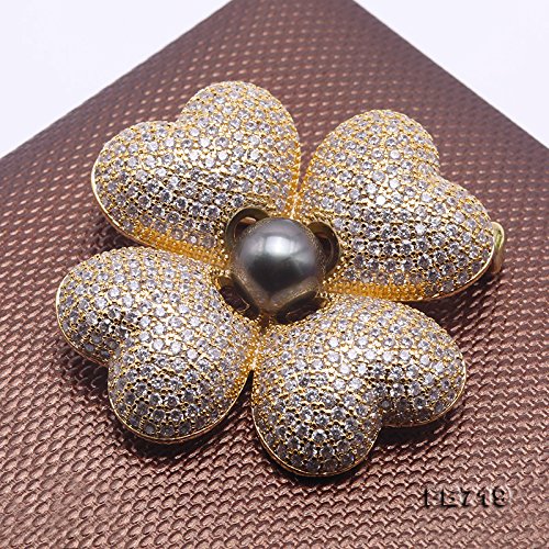 Description *Gorgeous Tahitian pearl brooch with beautiful Four Leaf Clover design. The clover is inlaid with sparkling zircons, with a 9mm black Tahitian pearl in the hand.