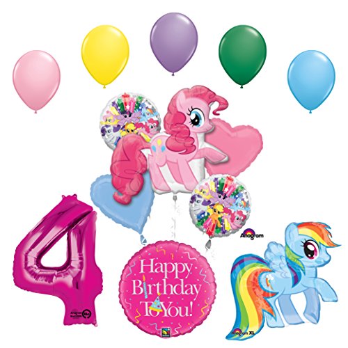 -. Binding : Toy -. Brand : Mayflower Products -. Color : multicolored -. EAN : 0708450609780 -. Feature : (1) 38 inch Pinkie Pie and (1) 28 inch Rainbow Dash Foil Balloon / (1) 34 inch Pink Number 4 Foil Balloon / (1) 18 inch Pink "Birthday Girl" P.R.Int on one side and "Happy Birthday to you" on the other side / (2) 18 inch My Little Pony Gang Round Foils and (2) 19 inch Foil Hearts 1-blue and 1-pink / (6) Color Coordinated 11" latex balloons -. IsAdultProduct : 0 -. Label : Mayflower -. Manufacturer : Mayflower -. MPN : BQ_519 -. PackageQuantity : 13 -. PartNumber : BQ_519 -. ProductGroup : Toy -. ProductTypeName : TOYS_AND_GAMES -. Publisher : Mayflower -. Studio : Mayflower -. Title : My Little Pony Pinkie Pie and Rainbow Dash 4th Birthday Party Supplies and Balloon Decorations -. UPC : 708450609780