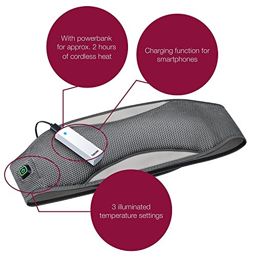 ReleaseDate : 2017-08-04 Studio : Beurer North America LP Publisher : Beurer North America LP Binding : Health and Beauty Product Description - Powerful power bank for approx. 2 hours of cordless heat - Ideal for indoors and outdoors - Maximum flexibility of movement - Does not appear bulky, can be worn under clothing - Charging function for smartphones - Removable power bank - Easy to use - Snuggly and skin-friendly - Easy to fasten - Wide rubber strap with hook-and-loop fastener - Comfortable to wear - 3 illuminated temperature settings - Automatic switch-off after approx. 110 min - Temperature monitoring with safety switch-off - With power bank (charging time approx. 6 hours), charging cable and storage bag - Machine washable up to 86 Degree 0