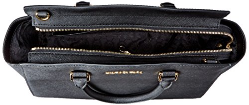 A luxe saffiano leather MICHAEL Michael Kors satchel in a classic silhouette. Gold-tone lettering details the front, and an inset zip opens to a logo-lined interior with 4 notch pockets and a zip pouch. Metal feet. Double rolled handles and optional shoulder strap. Dust bag included.Feature
