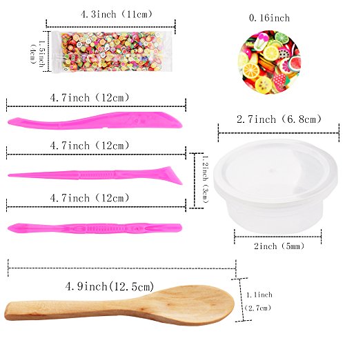 - The package including 6 pack fishbowl beads 1.1oz/ 30g per pack, 13 pack foam balls, 1 pack15 pieces clear slime containers,3 pack confetti,1 pack 8 pcs slime candys,1 pack slime pears,1 pack 1000 pcs fruit slice, 1 pack 3 pcs slime tools, 1 piece wooden spoon