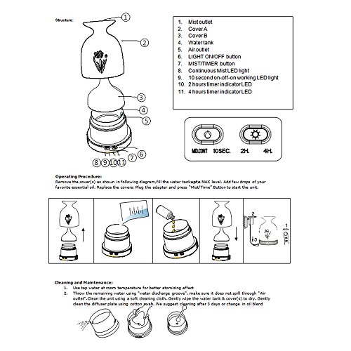 Handy Essential oil usage guide. Features: - Working time: Continuous mode (low/high mist) 6-4 hours, intermittent mode (low/high mist) 12-8 hours.
