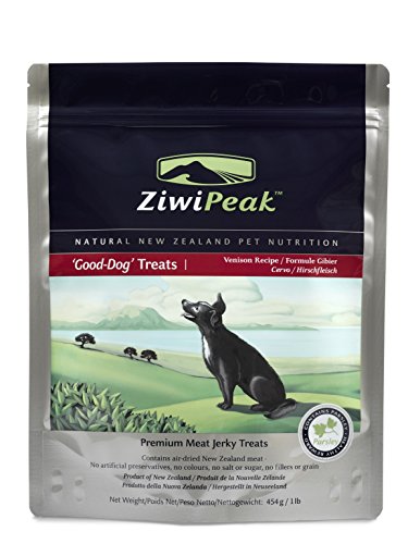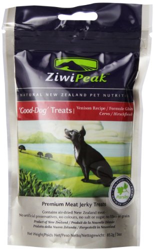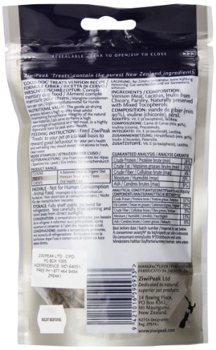 ZiwiPeak ‘Good-Dog' Venison Treats contain 100% natural, fresh, raw meat, just air-dried for convenience. ZiwiPeak Good-Dog Venison Rewards are treats to reward your loved companion, while also working on their nutritional health and wellbeing. Everything we create for your dog is made with their health, wellbeing and longevity top of mind. That philosophy stems to our treat range, which while rewarding your puppy or dog, also provides them with energy and good nutrition too. Like our cuisine, our treats work on your dog's digestion, energy, vitality, healthy coat and skin and reduced bad breath, stool volume and flatulence. Thanks to the goodness in each ZiwiPeak treat, remember to modify your portion size of ZiwiPeak cuisine at feeding times– your pet won't need as much if they have received a treat. ZiwiPeak treats are not intended as a complete daily diet, but as a premium real-meat jerky treat to occasionally reward your dog's good behavior.Feature