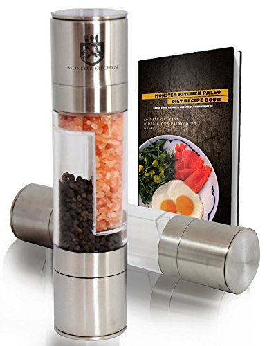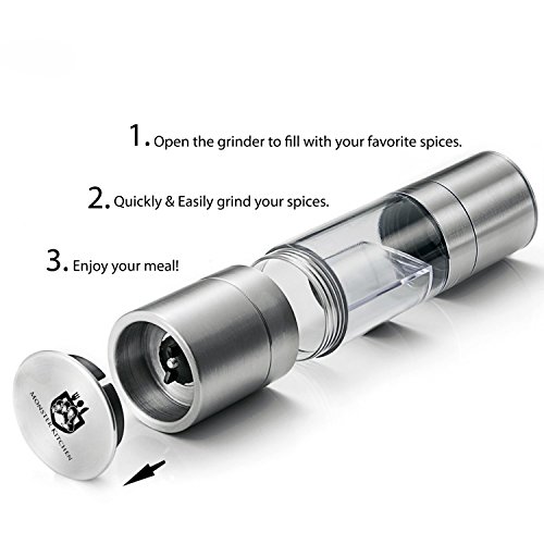 Features Benefits: ? Savor the flavor of freshly ground spices with Amazon's #1BEST-SELLER salt and pepper grinder set. ? Don't bother purchasing two grinders as you can combine them into our 2-in-1 grinder. ? Easy to use, sleek design that adds a touch of design to your countertop. ? Each Grinder is equipped with high quality stainless steel and 100% ceramic grinding mechanism ? Easily adjust the grinding setting by simply twisting the knob on the ends of the Grinder. ? Additional features include a base for precise seasoning,clear acrylic viewing chamber to identify the contents ? Each Monster Kitchen grinder comes with an instruction manual for proper instruction. ? This is an ECO Friendly equipment and BPA Free , which is healthy as we do care about your health.