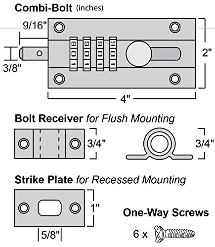 Looking for a flexible solution for sheds, barns, equipment, doors, gates, fences, or windows? The Combi-Bolt sliding gate latch offers an innovative security solution without hassle of keys. This slide bolt comes with pick-resistant dials, solid steel sliding bolt, and one-way security screws (delivering an extra level of protection). The one-way screws are designed to only turn one way when using screwdriver. Sloped slot means a screwdriver will simply slip out if you try to turn it counter-clockwise. The Combi-Bolt barrel locks were designed with extremely tight clearances to resist shims and other picking tools.