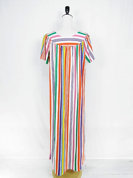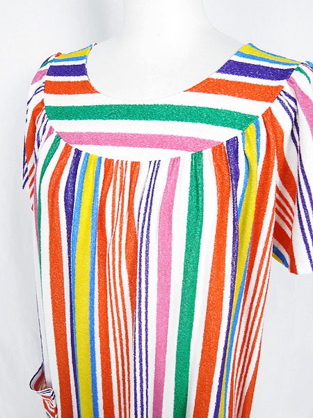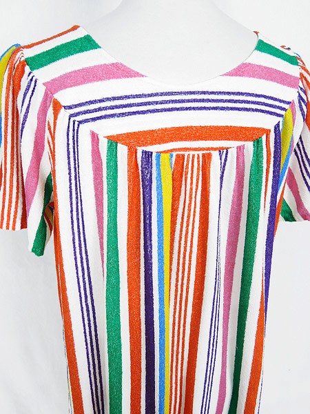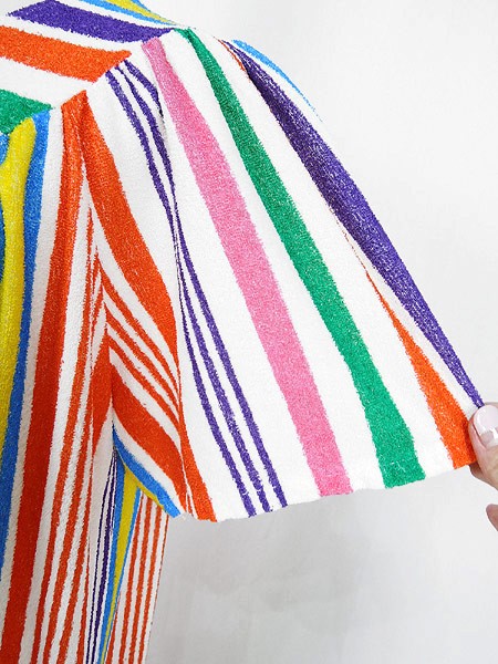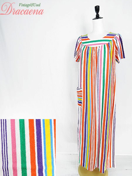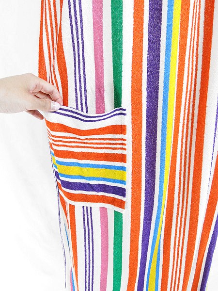 Ladies ブランド- カラーカラフル メール便不可 コンディション★★★ 素材- 表記サイズ- スタッフコメント裏地なし。タグなし。パイル地(タオル地)のような素材感です。全体に引っかけによる糸の出が数か所あります。 実寸サイズ 着丈 123 cm 身幅 52 cm 肩幅 33 cm 袖丈 20 cm ※ウエスト・ヒップ以外は平置き採寸