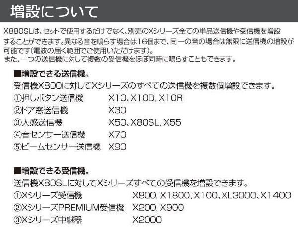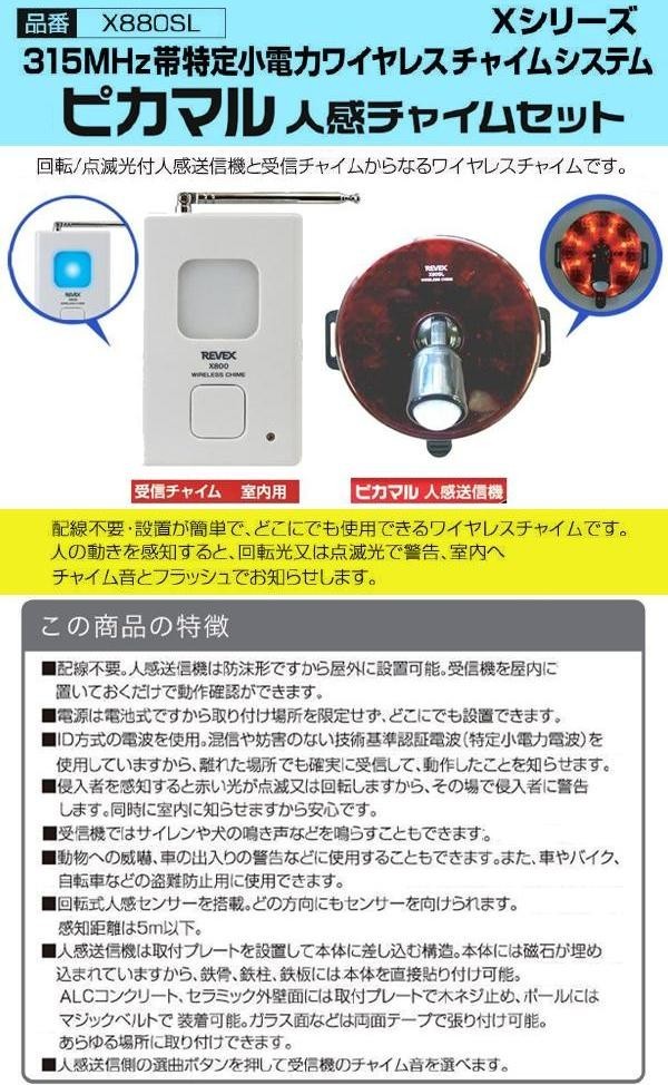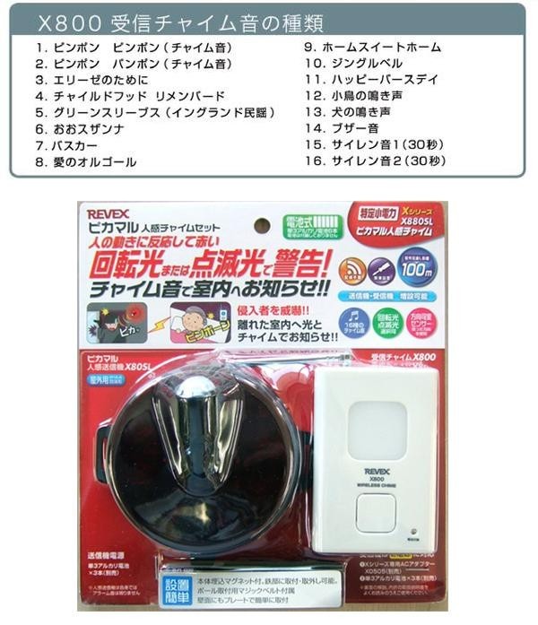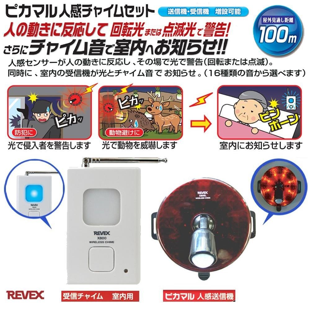 人感センサーが人の動きに反応し、その場で光で警告(回転または点滅)。同時に室内の受信機が光とチャイム音でお知らせします。1回感知すると15秒間点滅、又は回転します。防沫形なので軒下など多少の雨のかかる場所でも使用できます。※受信機(X800)・送信機(X80SL)ともに電池は付属しておりません。 |