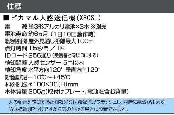 | 人感センサーが人の動きに反応し、その場で光で警告(回転または点滅)。同時に室内の受信機が光とチャイム音でお知らせします。1回感知すると15秒間点滅、又は回転します。防沫形なので軒下など多少の雨のかかる場所でも使用できます。※受信機(X800)・送信機(X80SL)ともに電池は付属しておりません。 |