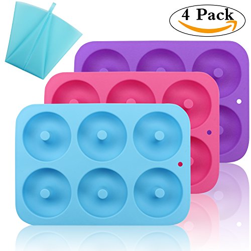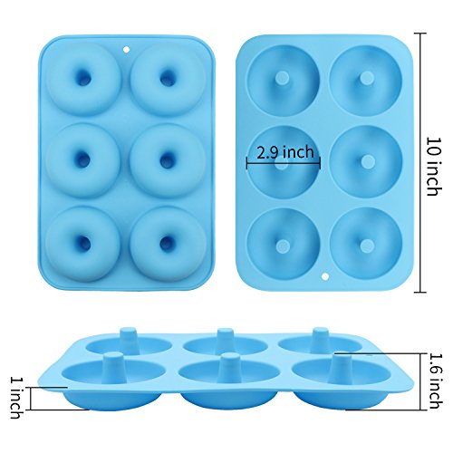 MOLD AND BAG SIZE:each has 6 Cavity Silicone Donut molds, molds size of each tray are 10*7*1 inch / 26*18*2.3 cm;bag size is 7.5*13.4 inch/ 19*34 cm
