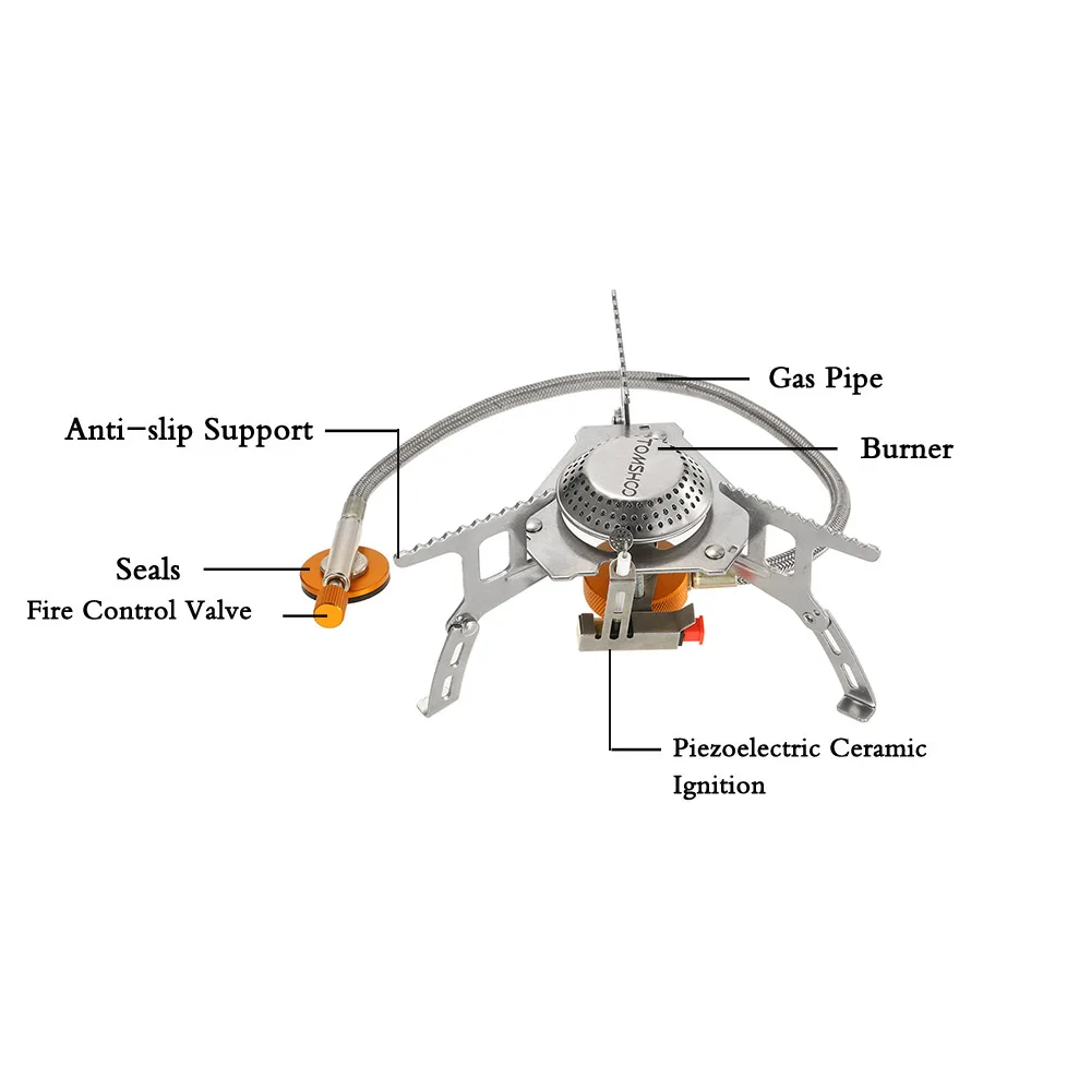 TOMSHOO camping stove includes a foldable gas stove, a 9-plate windshield and a gas cartridge converter. It is perfect for outdoor camping, hiking, backpacking, picnic, etc.
