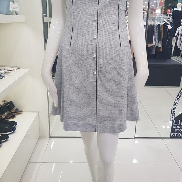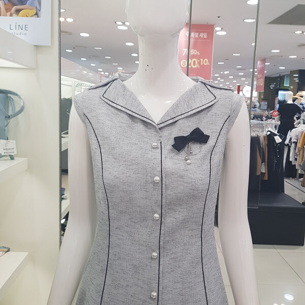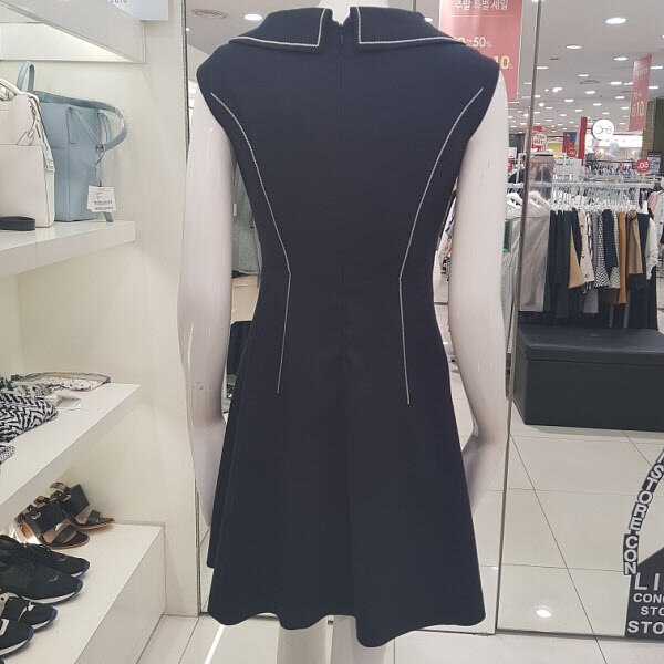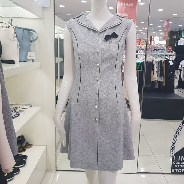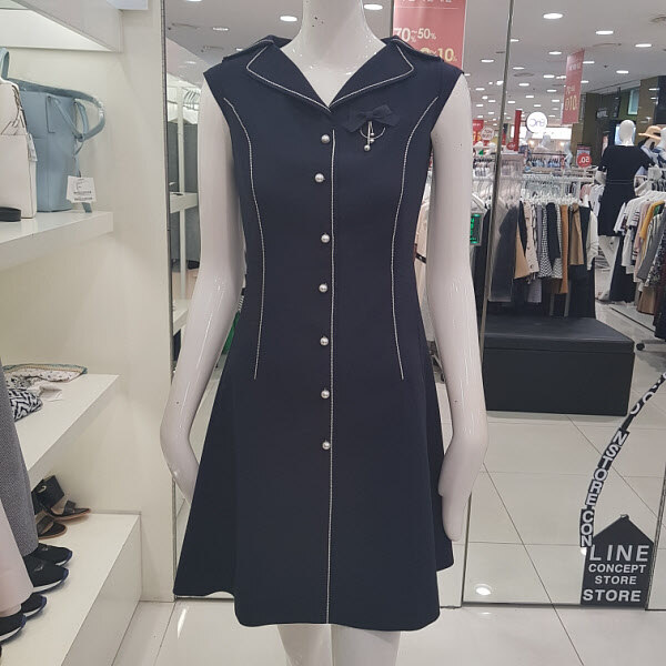 민소매 원피스로가운데에 진주 장식으로 포인트를 주어 고급스럽고 세련된 디자인의A라인원피스 입니다.허리선에 슬림핏으로 라인을 잡아 주어 날씬한몸매로 연출가능한여성스러운아이템입니다