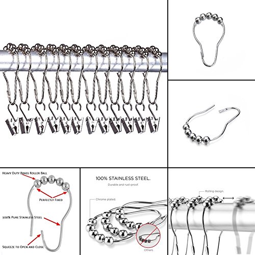 Smooth-rolling ball bearings ensure easy gliding along any type of shower curtain rod—no more tugging or snagging,Made of durable rust-resistant stainless steel with a polished chrome finish