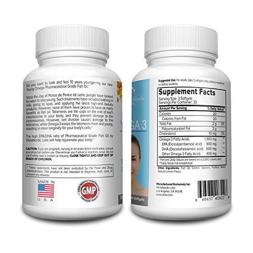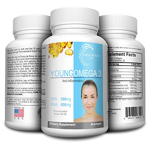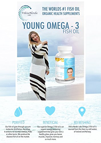 Strongest Anti-Inflammatory Blend Young Omega 3 fish oil with 2,700mg EPA and 1,800mg DHA per serving. After years of trial and error, we finally developed the most health conscious, all natural fish oil ever to hit the market. The reason our fish oil is superior to other brands out there on the market is because: we offer a more pure, potent omega-3 strain with highly concentrated blend of 2,700 mg EPA and 1,800 mg DHA per servings. We then use 100 gallons of healthy, food-grade Omega-3 rich fish oil to make a single gallon of ultra-refined Vikiia Nordic Labs Omega-3 Fish Oil Supplement, that is purred with molecular distillation-one of the few current methods that can purify from heavy metals, PCB's and other toxins to below detectable limits for human consumption. It is made in USA and is tested for purity. Other benefits:• Anti-Aging • Healthy, Strong Hair and Nails • Anti-Inflammatory • Promotes Heart, Kidney and Brain Health • Premium, Healthy Fatty Acids • No Fish Burps or Bad Aftertaste Improve your heart and brain health today by clicking "Add to Cart" above!Feature