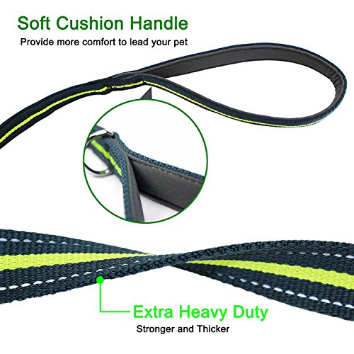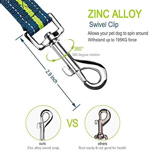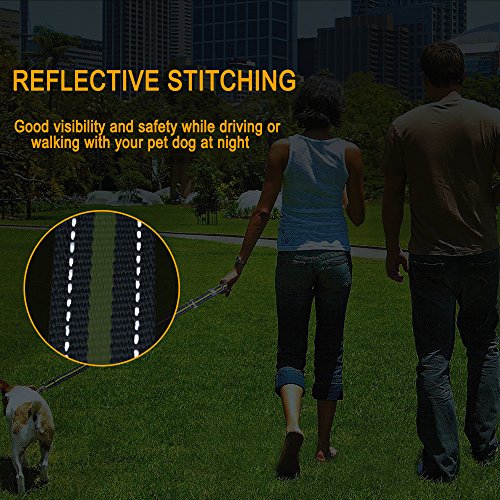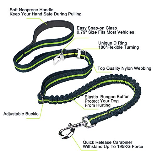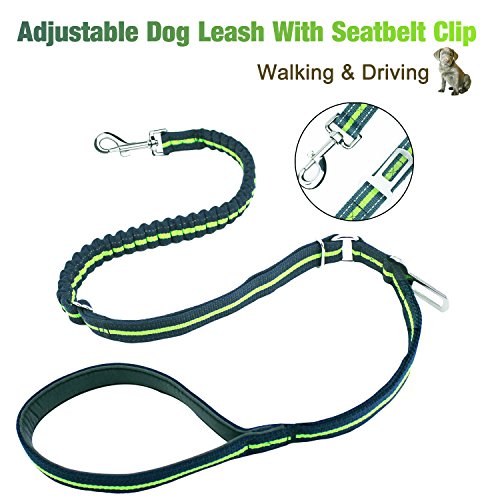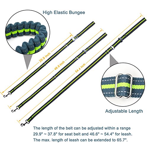 Feature: Dog Leash Seat Belt Combo:Designed to bring more peaceful and enjoyable moments when take your dog on walks or for a drive.Keep your beloved dog safe no matter where you go. Adjustable Length Elastic Design: adjustable length from 46.6" to 54.4 " and as seat belt length 29.9" making the dog leash suitable for Medium Big size dogs in a variety of positions like sitting, standing or lying down comfortably, besides walking and running. Safety: The pet Seat belt function is used to protect your pet, keeping the dog in the back seat, and away from the center console when you drive. While the reflective stitching maintains high visibility at night for safety. Top Quality Materials: Made of TOP quality nylon webbing and elastic bungee, plus the solid aluminum alloy swivel snap and buckle to guarantee most durability. Easy Convenient: Simply clip the seat belt onto your pet harness and snap the belt tab right into the seat belt , securing your pet into place. The seat belt clip wide 0.79"(2cm) fits most vehicles and easy to release from the seat belt slot, hassle-free clip simply hook the leash to your pet's harness. Specifications: Width: 1" (26mm) Adjustable size: 46.6"-54.4"(118cm-138cm) Extended length: 65.7"(167cm) Seat belt size:29.9"(76cm) Belt Tab Width: 0.79"(2cm) Caution:Dogs should not be allowed to chew on the leashes to avoid damages, please don't leave the leash set on your pet unattended. 0